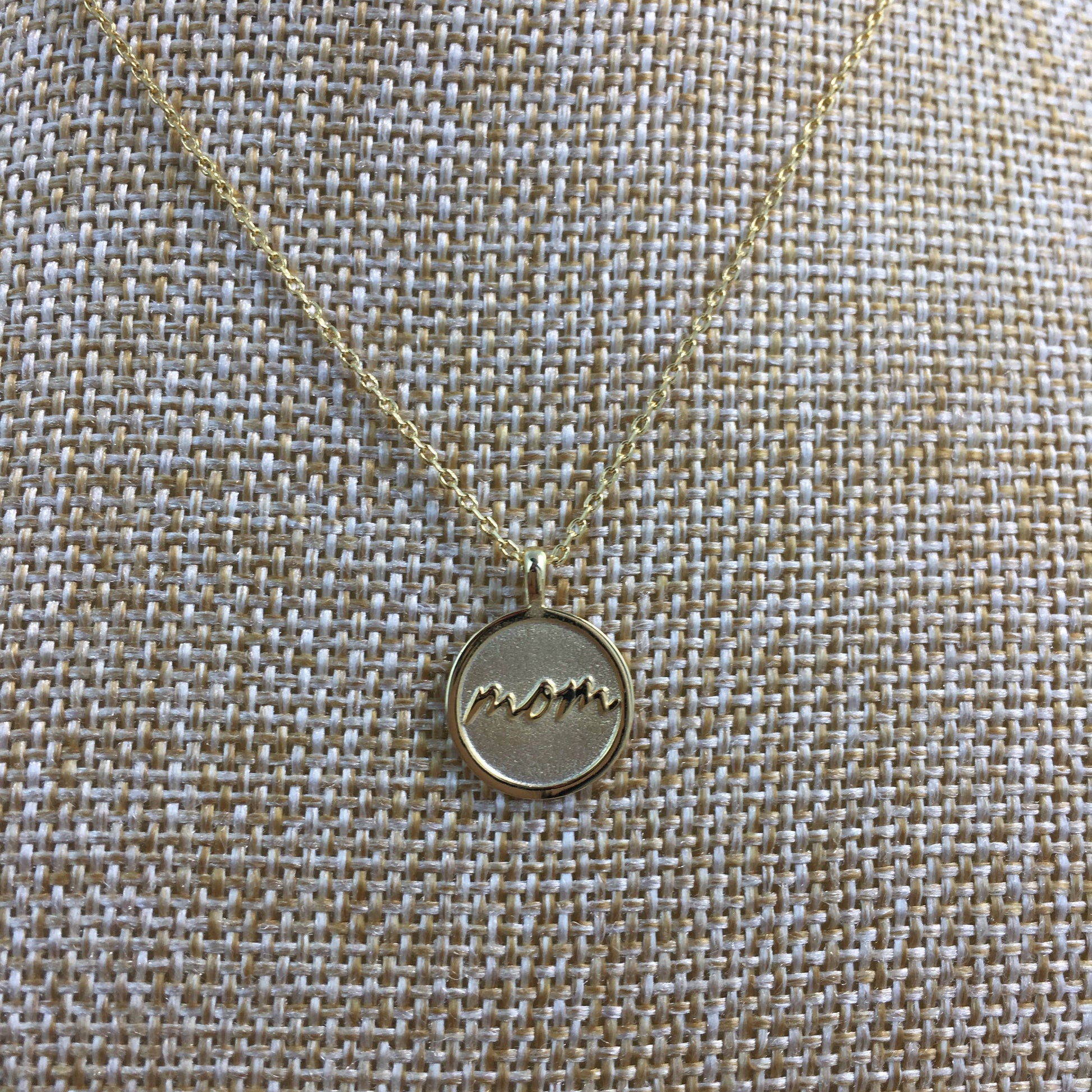 This is our gorgeous “Mom” circle necklace! This item is perfect for any Mama and is perfect for Mother’s Day! It is 18k gold dipped and has a 16 inch chain. Find more in our Mother’s Day collection!