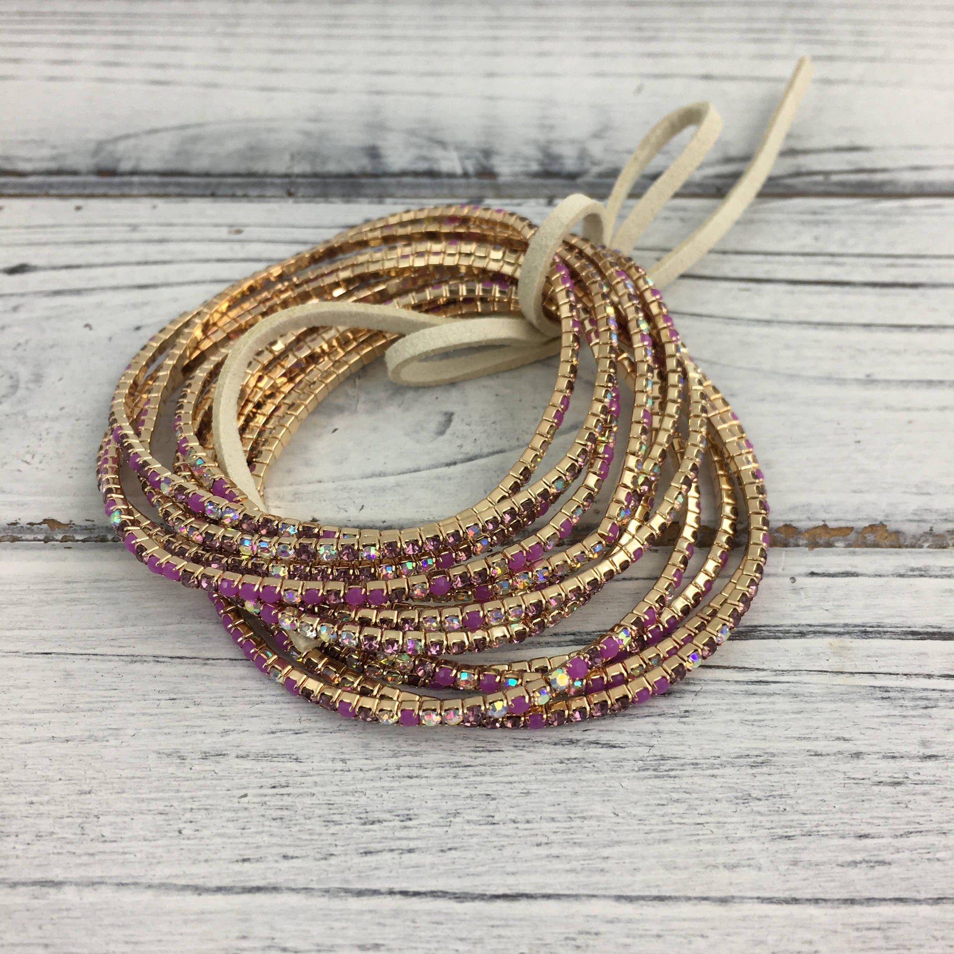 This is our gorgeous purple and gold bracelet! The metal of the bracelet is gold, and has varying shades of purple rhinestones!