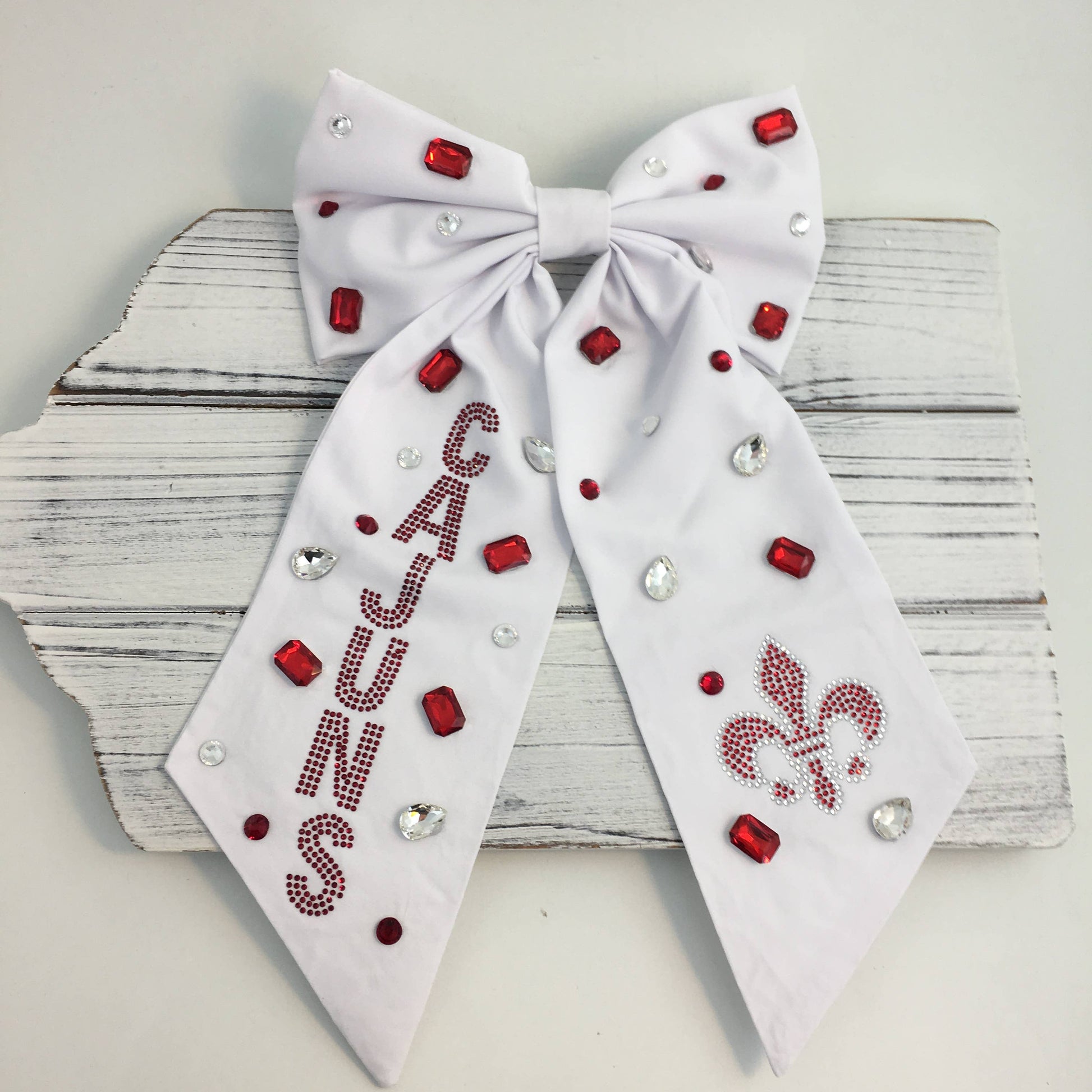 This is our gorgeous rhinestone Cajuns hair bow! This item is so cute and bold! It measures 6.5 inches across and 12 inches from top to bottom. Find more Cajuns items in our NOLA/Louisiana collection!