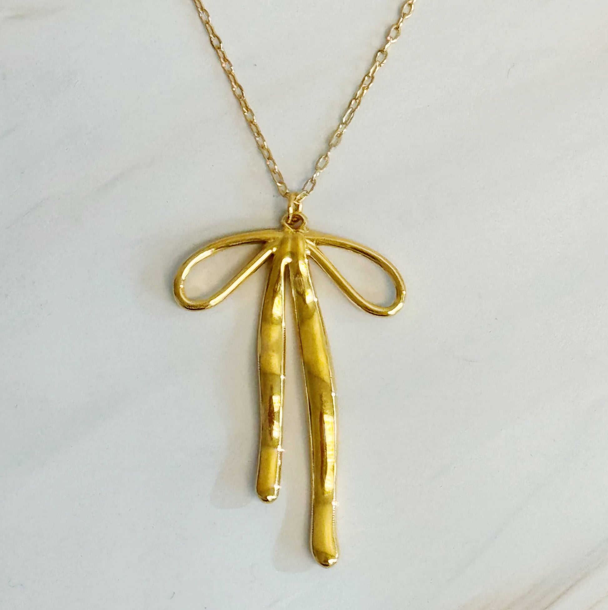 This stylish bow pendant necklace combines modern flair with classic elegance. Crafted with a unique bow design, this necklace is perfect for adding a touch of sophistication to any outfit. Elevate your style with this must-have accessory.