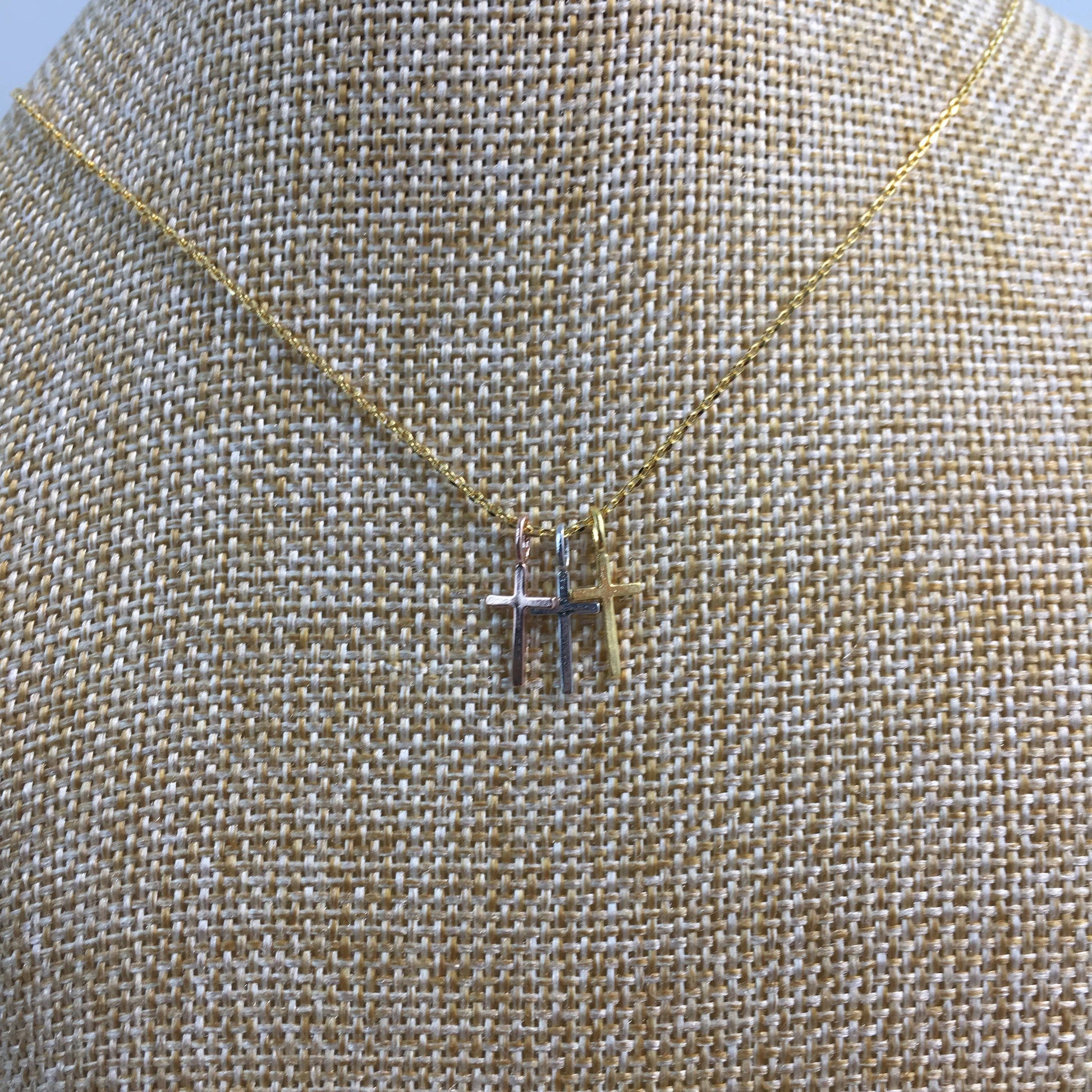 This is our gorgeous tri-tone cross pendants necklace! This item has 3 crosses: 1 rose gold, 1 gold, and 1 silver. This item is 18k gold dipped and a 16inch chain. Find more in our Fashion Jewelry collections!